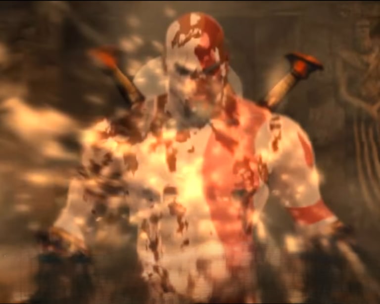 Consumido pela fúria e pelo remorso, Kratos renegou seu juramento a Ares. Como punição, a Oráculo da vila selou as cinzas de sua esposa e filha em sua pele, deixando-o com um tom acinzentado e cadavérico. A partir desse dia, ele passou a ser conhecido como o Fantasma de Esparta.