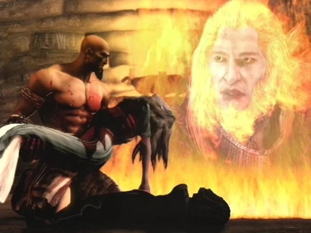 Kratos, ainda criança, tentou impedir, mas foi facilmente derrotado por Ares, que o arremessou para longe, deixando uma cicatriz em seu rosto. Sem poder fazer nada, Kratos acreditou que seu irmão estava morto. Tomado pelo desejo de se tornar mais forte, ele passou a treinar incansavelmente e tatuou em seu corpo as mesmas marcas vermelhas que seu irmão possuía.