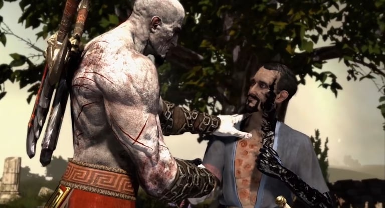 Mas foi apenas ao cruzar o caminho de um guerreiro espartano marcado por tatuagens e sede de batalha que Ares enxergou sua verdadeira arma. Com a ajuda das Fúrias, ele manipulou Kratos a selar um juramento de sangue, tornando-o seu campeão. Para moldá-lo por completo, Ares orquestrou a tragédia definitiva: fez com que Kratos assassinasse, sem saber, sua esposa Lisandra e sua filha Calíope.